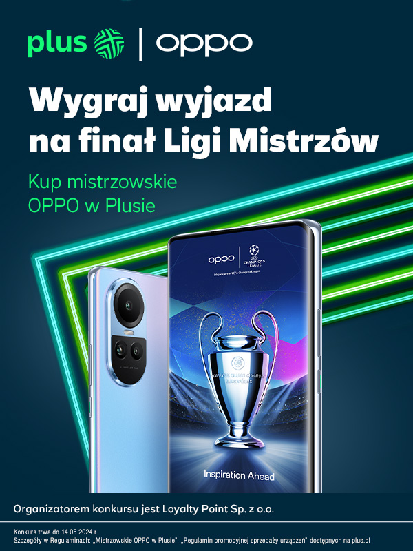 Plus i OPPO startują z konkursem, w którym do wygrania jest wyjazd na najważniejsze klubowe wydarzenie w europejskiej piłce nożnej – finał Ligi Mistrzów w Londynie. Warunkiem skorzystania z promocji jest zakup mistrzowskiego smartfonu marki OPPO. Nagrody wygrywają autorzy najciekawszych odpowiedzi na pytanie konkursowe.