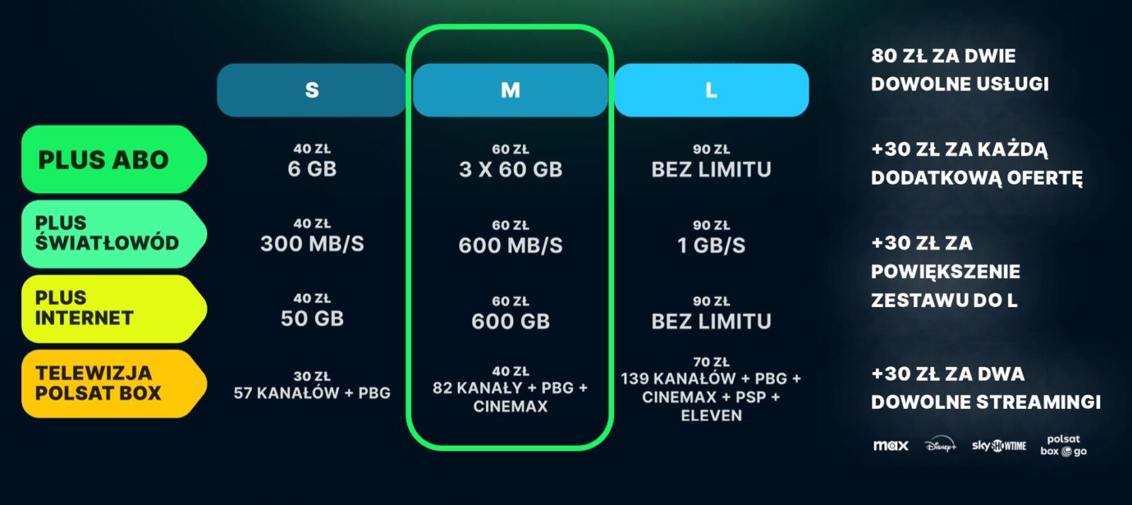 Plus i Polsat Box z nowym otwarciem – na i dla klientów. To odpowiedź na pytania i dylematy – ile to naprawdę kosztuje, ile zapłacę za dwie, a ile za trzy usługi. Teraz, proces wyboru i łączenia – światłowodu, telewizji, internetu mobilnego, abonamentu komórkowego oraz streamingów będzie jeszcze łatwiejszy, wygodniejszy, lepiej dopasowany do potrzeb klienta, a całość jeszcze bardziej atrakcyjna cenowo. Dostępna od 2 czerwca br. zarówno dla nowych, jak i obecnych klientów oferta to – proste abonamenty S, M, L oraz łatwe, przejrzyste zasady łączenia usług.
