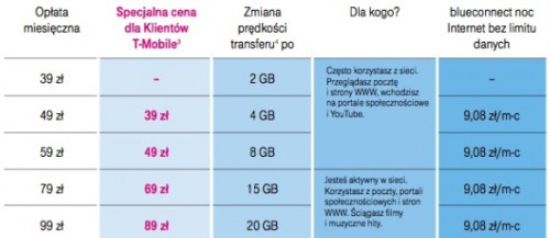 W ofercie z modemem, czyli skierowanej do tych, którzy posiadają już laptopa lub tablet, Operator oferuje teraz 5 poziomów abonamentu. W ofercie blueconnect 59 z limitem danych 8 GB abonament dla klientów T-Mobile wynosi jedynie 49 zł. Klienci, którzy szczególnie intensywnie korzystają z internetu, mają do dyspozycji ofertę blueconnect 99 z limitem danych aż 20 GB.
