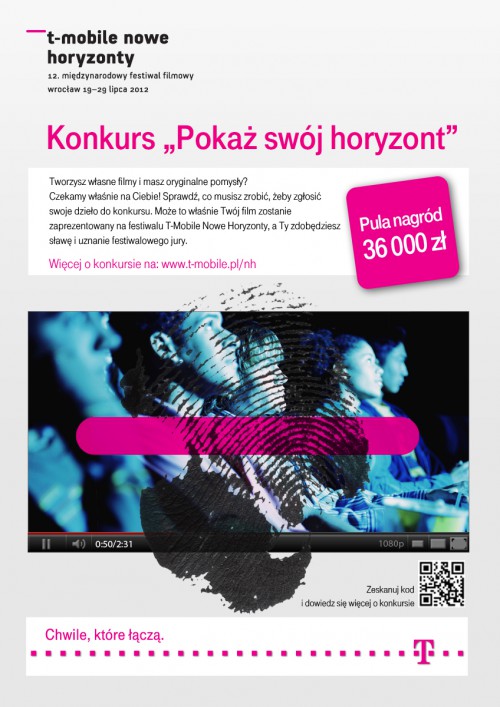 Już dziś, 10 maja rusza konkurs „Pokaż swój horyzont”, którego pomysłodawcą i organizatorem jest Polska Telefonia Cyfrowa. Konkurs skierowany jest do wszystkich, którzy mają zaskakujący pomysł na zinterpretowanie przewodniego hasła konkursowego. Podzielony jest na dwie kategorie: dla profesjonalistów oraz amatorów. Amatorzy będą walczyć o nagrody rzeczowe w 7-tygodniowych etapach. Profesjonaliści swoje prace mogą przesyłać do końca czerwca br. Najlepsze z nich zostaną zaprezentowane na wielkim ekranie przed każdą projekcją festiwalową podczas festiwalu T-Mobile Nowe Horyzonty we Wrocławiu.