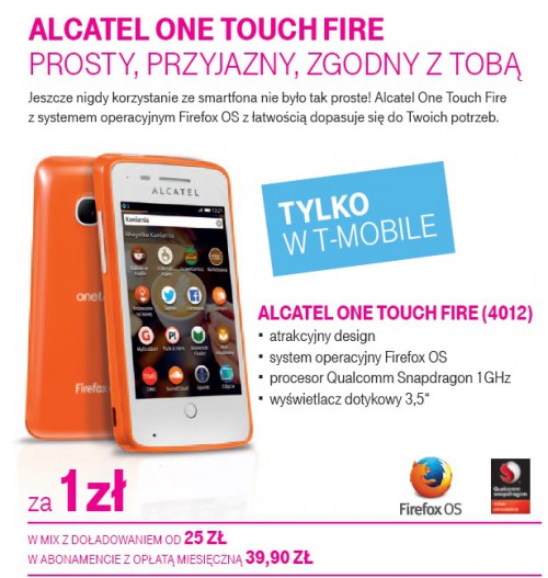 T-Mobile jest pierwszym i jedynym operatorem w Polsce, który ma w swojej ofercie telefon z systemem operacyjnym Firefox OS – Alcatel One Touch Fire. Telefon jest dostępny we wszystkich ofertach i kanałach sprzedaży. W ofercie Mix telefon jest dostępny od 1zł z doładowaniem od 25 zł. W ofercie abonamentowej cena urządzenia wynosi 1 złoty niezależnie od wybranej taryfy.