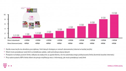 Klient będzie informowany o zużyciu 80% danych w danym okresie, a w dowolnym momencie będzie mógł podnieść limit dokupując wybrany pakiet. W wyższych taryfach w ramach oferty klienci otrzymają również minuty na połączenia do krajów UE, połączenia wychodzące i przychodzące w ramach roamingu w UE. Klienci usług biznesowych znajdą w swoich taryfach również pakiety danych do wykorzystania w roamingu na terenie UE i całego świata.