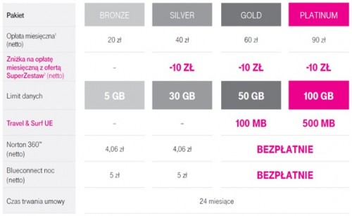 GOLD – dla użytkowników intensywnie korzystających z sieci. W pakiet wliczonych jest 30 GB danych. Nowością w tym wariancie jest usługa Budżet na urządzenie, która przy zakupie następnych urządzeń z szerokiego portfolio operatora zarówno w ofercie głosowej jaki Internetu LTE pozwoli uzyskać kolejne oszczędności poprzez obniżenie ceny urządzenia.