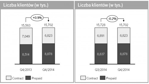 Na koniec 2014 roku, T-Mobile Polska obsługiwała bazę 15,702 miliona klientów, co stanowi wzrost o 138 tysięcy klientów w porównaniu do 2013 roku. Spółka zakończyła rok z bazą 8,878 miliona klientów w segmencie usług przedpłaconych oraz 6,823 miliona klientów w segmencie usług abonamentowych. Liczba klientów kontraktowych w 2014 roku zmniejszyła się o 226 tysięcy, a klientów usług przedpłaconych wzrosła o 364 tysiące w porównaniu do ubiegłego roku. Jednocześnie w samym czwartym kwartale 2014 roku liczba klientów Spółki zmniejszyła się o 27 tysięcy w porównaniu do poprzedniego kwartału.