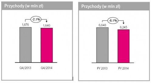 W czwartym kwartale 2014 roku przychody T-Mobile Polska wyniosły 1,640 miliarda złotych i były najwyższe spośród wszystkich kwartałów tego roku. W porównaniu do czwartego kwartału 2013 roku przychody Spółki były niższe o 2,1%. W całym 2014 roku przychody Spółki zamknęły się kwotą 6,245 miliarda złotych i były niższe o 6,1% w porównaniu do analogicznego okresu ubiegłego roku.