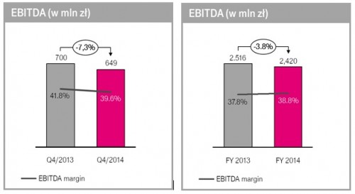 W okresie od 1 października do 31 grudnia 2014 roku EBITDA T-Mobile Polska wyniosła 649 miliony złotych i była niższa o 7,3% w porównaniu do tego samego okresu w ubiegłym roku. W tym samym czasie marża EBITDA wyniosła 39,6% i była niższa o 2,2 punktu procentowego niż w czwartym kwartale 2013 roku. W całym 2014 roku marża EBITDA wyniosła 38,8% i była wyższa o 0,9 punktu procentowego niż w 2013 roku. W 2014 roku wypracowana przez Spółkę EBITDA to 2,42 miliarda złotych, niższa o 3,8% w porównaniu do ubiegłego roku.