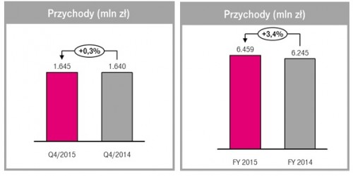 T-Mobile Polska opublikowała dziś swoje wyniki finansowe i operacyjne uzyskane w 2015 roku. Przychody Spółki osiągnęły w czwartym kwartale 2015 roku 1,645 miliarda złotych. Dzięki pozytywnemu wpływowi integracji z GTS Poland w całym 2015 roku przychody T-Mobile Polska wyniosły 6,459 miliarda złotych i były wyższe o 3,4% w porównaniu do 2014 roku.