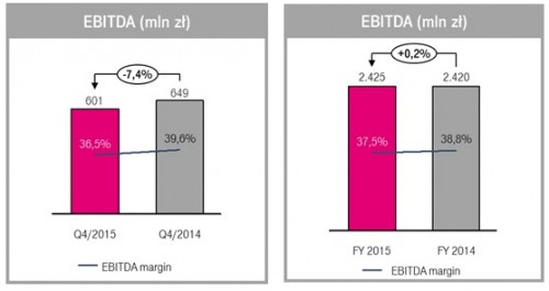 W czwartym kwartale 2015 roku skonsolidowany zysk EBITDA Spółki wyniósł 601 milionów złotych. Marża EBITDA w tym okresie osiągnęła poziom 36,5 % zmniejszając się o 3,1 punktu procentowego w porównaniu do czwartego kwartału 2014 roku. Wypracowany przez Spółkę skonsolidowany zysk EBIDTA w 2015 roku wyniósł 2,425 miliarda złotych i był wyższy o 0,2% w porównaniu do analogicznego okresu ubiegłego roku.