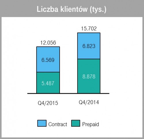 T-Mobile Polska na koniec grudnia 2015 roku obsługiwała bazę 12,056 miliona klientów i posiadała w segmencie usług przedpłaconych 5,487 miliona klientów, a w segmencie usług abonamentowych było to 6,569 miliona klientów. Niższa o ponad 3,6 miliona kart SIM baza klientów obsługiwanych przez T-Mobile Polska wynika w głównej mierze z wprowadzenia przez Spółkę nowego standardu dotyczącego terminu utrzymywania w systemach numerów prepaid po wygaśnięciu ich ważności.