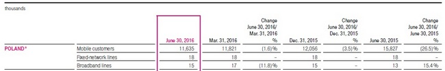 Deutsche Telekom opublikował dziś swoje wyniki finansowe uzyskane w drugim kwartale 2016 roku. T-Mobile Polska na koniec marca 2016 roku obsługiwała bazę 11,635 miliona klientów. W drugim kwartale tego roku liczba kart SIM zmniejszyła się o 1.6% w porównaniu do 11,821 mln na koniec pierwszego kwartału 2016 roku i o 26.5 % r/r. (15,827 mln).