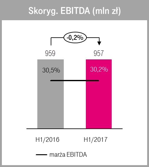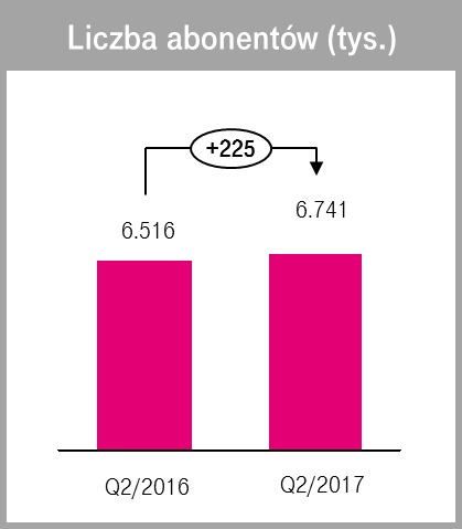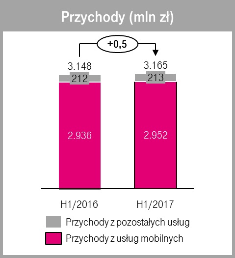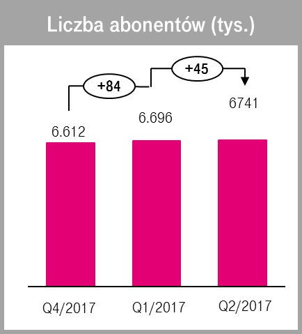 T‑Mobile Polska w pierwszej połowie 2017 roku zwiększył bazę abonentów w sumie o 129 tysięcy, a w samym drugim kwartale liczba abonentów wzrosła o 45 tysięcy. Spółka w tym czasie poprawiła również statystyki przenoszalności numerów, jak również zmniejszyła wskaźnik odejść klientów. Przychody całkowite i EBITDA w pierwszej połowie roku pozostały na praktycznie niezmienionym poziomie w stosunku do roku ubiegłego. T‑Mobile Polska stale inwestuje w przyśpieszenie i rozszerzenie zasięgu LTE, który obecnie obejmuje już 99,7% populacji kraju.