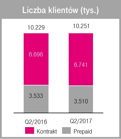 T‑Mobile Polska na koniec czerwca 2017 roku obsługiwał 10,251 miliona klientów. Baza abonentów wyniosła 6,741 miliona, a klientów usług przedpłaconych 3,510 miliona. Liczba aktywacji netto w bazie klientów kontraktowych w drugim kwartale 2017 r. wyniosła 45 tysięcy, co oznacza, że jest on już piątym z kolei kwartałem, w którym Spółka odnotowuje wzrost bazy klientów abonamentowych. W całej pierwszej połowie 2017 roku Spółka odnotowała wzrost łącznej liczby abonentów o 129 tysięcy. W drugim kwartale br. w segmencie klientów usług przedpłaconych nastąpiła stabilizacja po okresie spadków związanych z wprowadzeniem obowiązkowej rejestracji numerów prepaid w Polsce. W drugim kwartale 2017 roku zmniejszył się wskaźnik odejść klientów (churn) o 1,3 punktu procentowego w porównaniu do wyników Spółki w drugim kwartale roku ubiegłego.