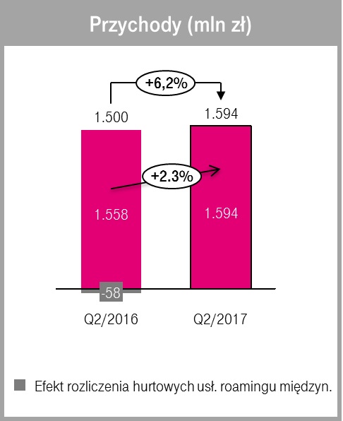 W drugim kwartale 2017 roku przychody całkowite T‑Mobile Polska osiągnęły wartość 1,594 miliarda złotych, a w całym pierwszym półroczu 2017 roku wyniosły 3,165 miliarda złotych i były wyższe o 0,5% w stosunku do analogicznego okresu 2016 roku. W drugim kwartale skorygowana EBITDA T‑Mobile Polska wyniosła 525 milionów złotych, a marża EBITDA osiągnęła poziom 32,9%. Bazując na porównywalnych danych, w drugim kwartale 2017 roku przychody całkowite T‑Mobile Polska wzrosły o 2,3%, a EBITDA zmniejszyła się o 4,6% w porównaniu do tego samego okresu w ubiegłym roku.