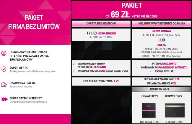 Od dnia 16 października T-Mobile Polska wprowadza nową ofertę Pakiet Firma bez Limitów dla Klienta biznesowego. Nowa oferta zawiera m.in. nielimitowany Internet do biura dostępny w całym kraju, Internet i rozmowy bez limitu, a wszystko bez haczyków.