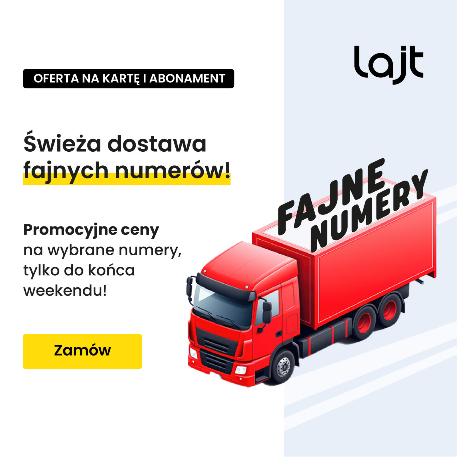 Odwiedź stronę www.lajtmobile.pl/klient-indywidualny/na-karte/ i wybierz numer, który wyróżni Cię z tłumu. Jeżeli chcesz wybrać ładny numer na abonament – zrobisz to w formularzu składania zamówienia. Pamiętaj, ilość numerów jest ograniczona, więc nie czekaj!