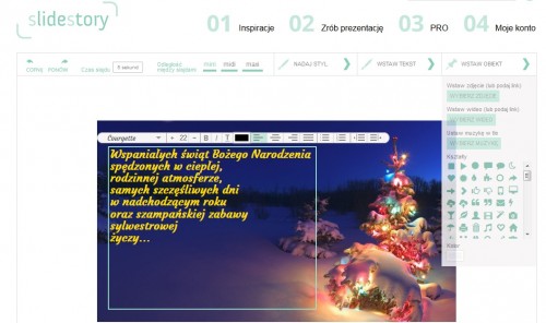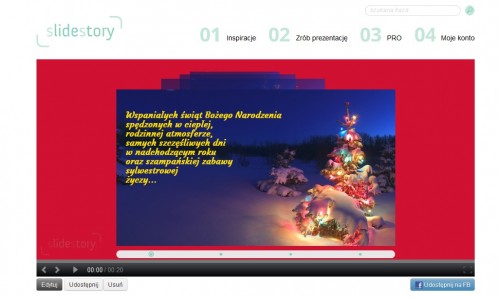Slidestory.pl, nowe narzędzie na scenie polskich serwisów do tworzenia bezpłatnych multimedialnych prezentacji online, może posłużyć do przygotowania wyjątkowych życzeń świątecznych. Pokaz zawierający rodzinne zdjęcia i ulubione kolędy może wywołać u odbiorcy większe wzruszenie, niż standardowa pocztówka lub życzenia przesłane SMS-em.
