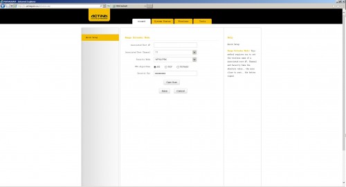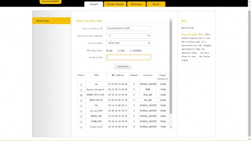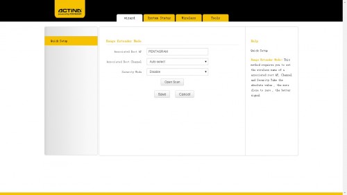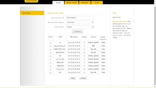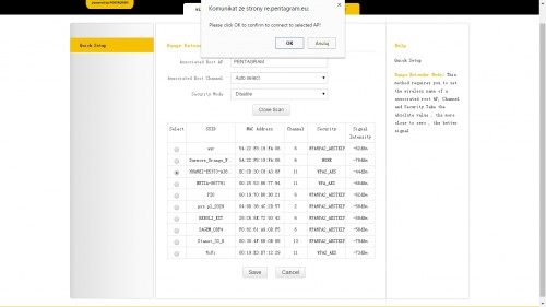 Pierwszym polem jest nazwa sieci jaką chcemy aby nasz repeater nadawał, drugą kanał a trzecią zabezpieczenie sieci. Pod tymi opcjami mamy przycisk Open Scan, który przeskanuje dostępne sieci bezprzewodowe, w celu umożliwienia połączenia z naszym routerem. Całość pojawia się w postaci przejrzystej listy.