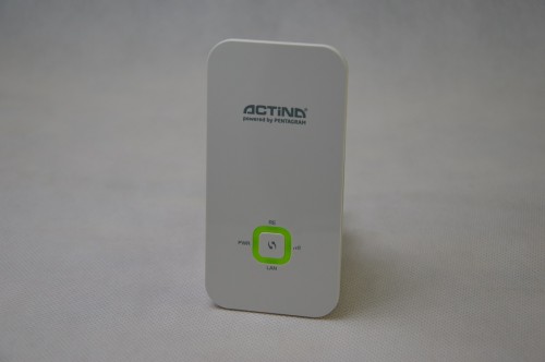 Całe urządzenie zostało wykonane z tworzywa sztucznego. Wszystkie elementy zostały dobrze spasowane, obudowa nie trzeszczy i nie ugina się pod naciskiem. Na przodzie znajdziemy logo Actina powered by PENTAGRAM oraz przycisk WPS, który otoczony jest diodami informującymi nas o statusie urządzenia (m.in. połączenie LAN, zasilanie oraz status sieci bezprzewodowej). Front ma błyszczące wykończenie, dlatego bardzo łatwo przyciąga kurz i zbiera odciski palców, chociaż wygląda elegancko. Z tyłu znajduje się wtyczka sieciowa, a pod spodem urządzenia znajdziemy port sieciowy LAN oraz przycisk reset, za pomocą którego możemy przywrócić urządzenie do ustawień fabrycznych.