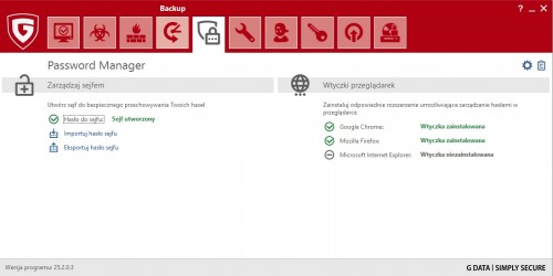 G DATA Password Manager zapamiętuje hasła m.in. do sklepów internetowych, forów dyskusyjnych i kont e-mail. Dla użytkownika łatwy w użyciu Password Manager jest ikoną na pasku przeglądarki. Jeśli to konieczne po kliknięciu przechowuje hasła do serwisów internetowych. Dane są szyfrowane i przechowywane na dysku twardym. Tylko użytkownik za pomocą hasła głównego (tzw. hasło master) może uzyskać do nich dostęp. Ten moduł wyznacza kres arkuszom, w których zapisujemy hasła i tym samym hasłom do wszelkich stron internetowych.