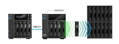Moduł AS6004U dzięki wykorzystaniu portu USB 3.0 może być podłączony do dowolnego urządzenia NAS firmy Asustor. Serie AS31/32/50/51/61/62/63/64/70 pozwalają na podpięcie jednocześnie trzech modułów rozszerzających. Pozostałe natomiast umożliwiają wykorzystanie jednocześnie dwóch modułów.
