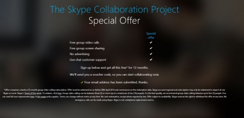 Microsoft, przygotował nie lada gratkę dla użytkowników Skype’a. Wystarczy wejść na stronę rejestracyjną, podać swój dowolny adres email i można korzystać z usługi Skype Premium, za darmo przez okrągły rok. Oferta obowiązuje do 30 kwietnia 2014 r.