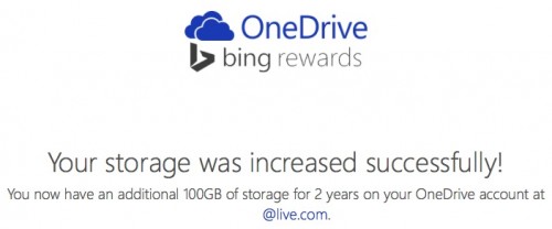 Nagrodą za zapisanie się do programu Bing Rewards, są te darmowe 100 GB. Do tej pory akcja była dostępna tylko dla klientów z USA. Należy pamiętać, że po 2 latach, jeżeli nie zrezygnujemy z „promocji”, to za dodatkowe miejsce w OneDrive będziemy musieli zapłacić. Obecnie każdy nowy użytkownik OneDrive otrzymuje na start 15 GB bezpłatnej przestrzeni dyskowej. Miesięczna opłata za korzystanie z 100 GB dysku OneDrive wynosi 8 PLN.