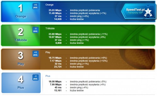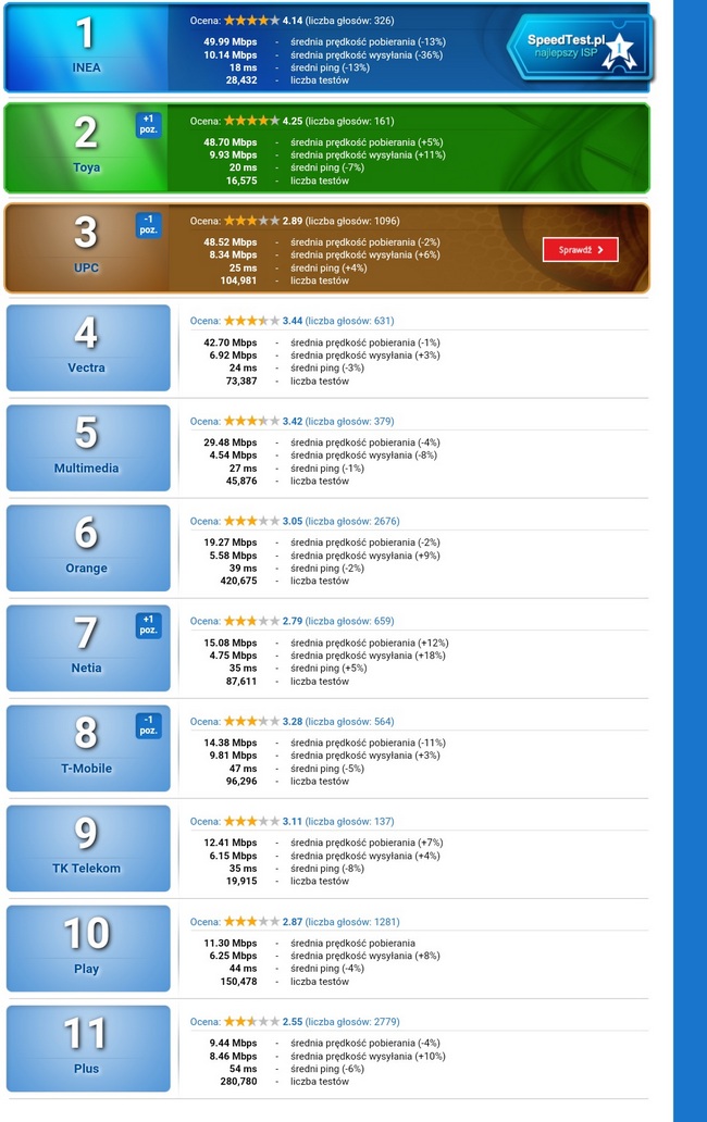 SpeedTest podsumował polskich najlepszych dostawców Internetu w styczniu 2017. W klasyfikacji Internetu mobilnego i Orange i T-Mobile. INEA utrzymuje pozycję lidera w zestawieniu najszybszych dostawców internetu w Polsce.