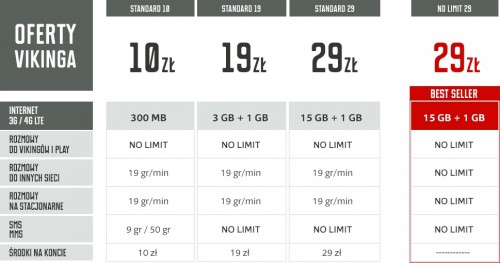 Ofertę uzupełniają taryfy standardowe – Viking 10 w dotychczasowej formie oraz Viking 29 (tutaj pakiet oferowanego internetu również został znacznie powiększony – o 11 GB + 1 GB za autodoładowanie). Szczegóły znajdują się w tabeli.