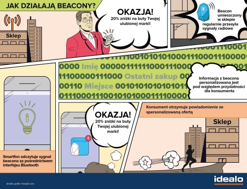Porównywarka cen idealo.pl postanowiła przybliżyć konsumentom tę technologię za pomocą krótkiego poradnika. Klienci sklepów mogą dowiedzieć się w nim, gdzie znajdą beacony, jakie aplikacje pomogą im w ich obsługiwaniu oraz jakie korzyści mogą z nich czerpać. Mechanizm działania beaconów idealo w przystępny sposób wyjaśnia na zabawnej infografice.