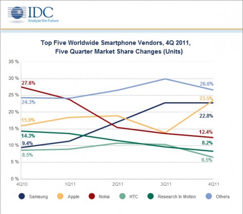 Firma badawcza IDC prognozuje, że w 2011 roku na całym świecie sprzedanych zostało ponad 491.4 milionów smartfonów, w porównaniu do 304.7 miliona w roku 2011, oznacza to wzrost o 61.3%. Samsung jest pierwszym producentem telefonów na świecie pod względem ilości urządzeń, wyprzedzając Apple.