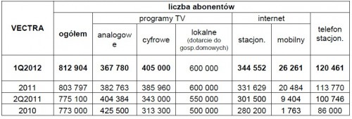 Ze stale wysoką dynamiką rośnie także liczba odbiorców pozostałych usług Vectry. Poniżej tabela przedstawiająca liczby abonentów operatora w dniu 31 marca 2012 roku: