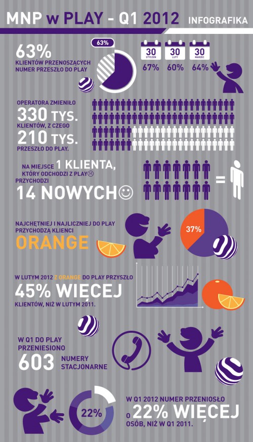 Według danych rpkom.pl średnio każdy z dużych telekomów oddał konkurencji ponad 100 tys. numerów, a przyjął około 40 tys.. Najwięcej w I kw. br. przeniesiono numerów do innych sieci z Orange: o kilkanaście tysięcy więcej niż z Polskiej Telefonii Cyfrowej (T-Mobile radził sobie tu najlepiej) i więcej niż z Polkomtela (Plus). Dane te mogą zaskakiwać, tym bardziej, że komórkowa sieć Orange walczy z Play na rynku MNP i w pierwszym kwartale emitowała w telewizji specjalny spot reklamowy.
