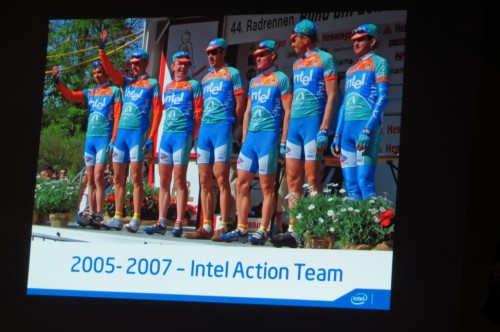 Intel aktywnie wspiera sportowców różnych dyscyplin. W Polsce przez 2 lata firma sponsorowała kolarzy najlepszej w Polsce zawodowej grupy Intel – Action. Była to jedyna polska ekipa znajdująca się wyżej niż Continental Teams (odpowiednik dawnej III dywizji), a mianowicie zaliczająca się do Professional Continental Teams (najwyższa kategoria po Pro Tour Teams, odpowiednik dawnej II dywizji).