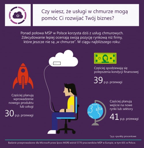 Nowe technologie są realnym wsparciem dla małych i średnich firm w rozwoju ich biznesu – pokazują badania Ipsos MORI przeprowadzone na zlecenie Microsoft. Firmy „w chmurze” lepiej oceniają swoją sytuację na rynku i śmielej patrzą w przyszłość. Co więcej, raport BCG na temat wykorzystania technologii przez MŚP pokazuje, że najbardziej zaawansowane technologicznie przedsiębiorstwa osiągają znacznie wyższe przychody i tworzą więcej miejsc pracy.
