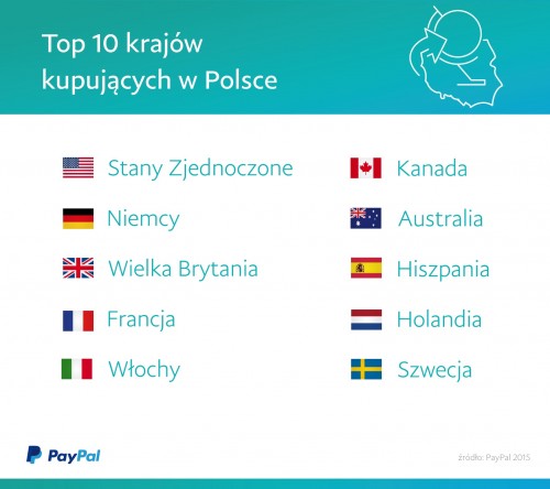 Rosnąca grupa kupujących transgranicznie i szukających w Polsce najlepszych ofert, jest naprawdę międzynarodowa. Zgodnie z danymi PayPal, Top 10 państw, których mieszkańcy najczęściej kupują online w Polsce to: Stany Zjednoczone, Wielka Brytania, Niemcy, Francja Włochy, Kanada, Australia, Hiszpania i Holandia oraz Szwecja.