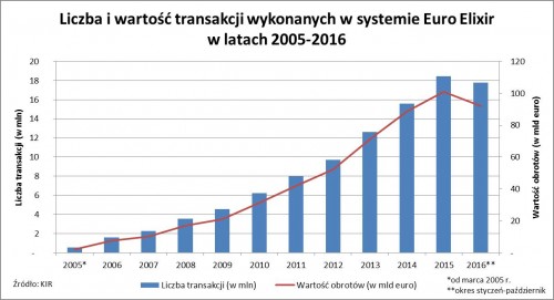 Liczba transakcji przetwarzanych w systemie Euro Elixir, od momentu wdrożenia w 2005 r., stale rośnie. W pierwszym roku funkcjonowania systemu, KIR rozliczył w nim ponad 544 tys. komunikatów o wartości ponad 2 mld euro. Obecnie, tylko w jednym miesiącu, Euro Elixir przetwarza średnio 1,7 mln przelewów o wartości ok. 9,2 mld euro. Od początku uruchomienia systemu, przeprowadzono w nim ponad 100 mln transakcji na kwotę ponad 536 mld euro.