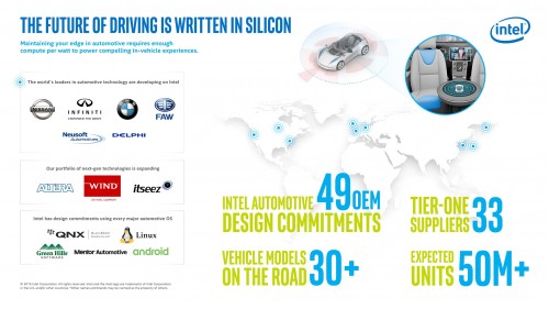 Intel przedstawił również szczegółowe informacje na temat procesorów Intel Atom przeznaczonych dla przemysłu samochodowego. Procesory z serii A3900 zostały zaprojektowane z myślą o autach nowej generacji. Umożliwiają one utworzenie kompleksowego, sterowanego programowo systemu kabiny kierowcy. System ten, obejmujący rozwiązanie informacyjno-rozrywkowe, klastry instrumentów cyfrowych oraz zaawansowane systemy wspomagające kierowcę ADAS (z ang. Advanced Driver Assistance Systems), mieści się w niewielkim, ekonomicznym układzie scalonym typu SoC (z ang. System-on-a-Chip). Dzięki procesorom A3900 producenci samochodów będą mogli zaoferować urządzenia o znacznie większym determinizmie pomiarów, które ułatwią kierowcom podejmowanie decyzji w czasie rzeczywistym. Taki standard urządzeń jest oczekiwany od pojazdów nowej generacji. Obecnie procesory te są testowane przez klientów. Na rynku pojawią się w pierwszym kwartale 2017 roku.