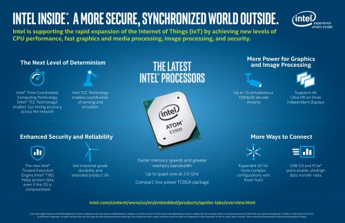 Nowe procesory Intel Atom z serii E3900 zostały zaprojektowane z myślą o szybkim rozwoju i wzroście złożoności technologii Internetu rzeczy. Charakteryzują się wydajnością, mocą przetwarzania i skalowalnością. Mimo niewielkich rozmiarów zapewniają nowy, wyższy poziom bezpieczeństwa, determinizmu pomiarów (niezawodności i powtarzalności ważnej zwłaszcza w zastosowaniach przemysłowych) oraz mocy obliczeniowej wymaganej do przetwarzania obrazów i nagrań wideo. Ułatwią opracowanie innowacyjnych technologii Internetu rzeczy w wielu obszarach ― od nagrywania filmów wideo poprzez różne gałęzie przemysłu i produkcji po handel detaliczny.
