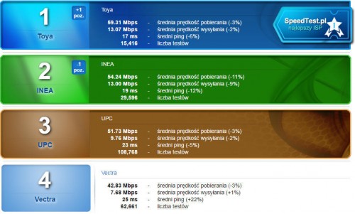 W kwietniowym rankingu ogólnopolskim dostawców Internetu sytuacja wygląda dość podobnie jak w poprzednich miesiącach. Podium należy cały czas do tej samej trójki: Toya, Inea oraz UPC.