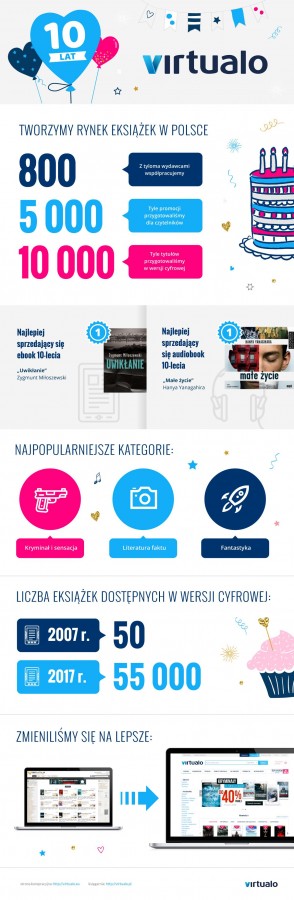 Ponad 50 000 ebooków i 5700 audiobooków w ofercie. Współpraca z 800 wydawcami, cykliczny wzrost sprzedaży na poziomie nawet 100%. Pierwszy przekrojowy raport o polskim rynku ebooków, aktywny udział w rozwoju branży i edukacji e-czytelników. Firma Virtualo podsumowuje 10 lat istnienia na rynku i wkład w popularyzację cyfrowych książek.
