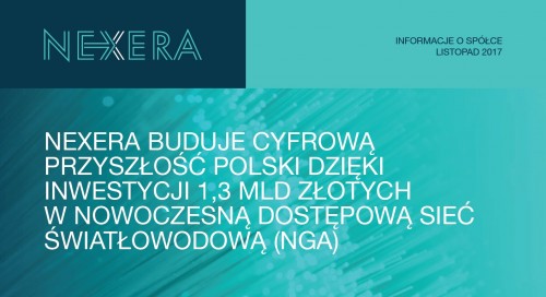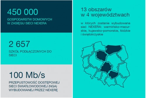 W ciągu trzech lat w zasięgu sieci znajdzie się 450 000 gospodarstw domowych, z czego ponad 280 000 gospodarstw uzyska dostęp do sieci dzięki dofinansowaniu w ramach POPC. Dodatkowo, NEXERA doprowadzi sieć do ponad 2 600 szkół. NEXERA będzie działała w modelu całkowicie hurtowym, co oznacza, że wybudowaną przez siebie infrastrukturę będzie udostępniać detalicznym operatorom telekomunikacyjnym. Obecnie Grupa koncentruje się na realizacji projektów budowy dostępowej sieci światłowodowej w 13 obszarach konkursowych POPC w środkowej i północno-wschodniej Polsce.