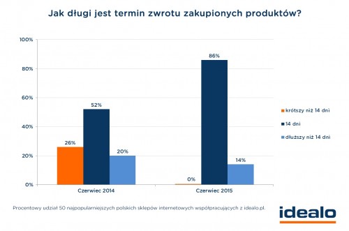 Przed 25 grudnia 2014 konsumenci mieli prawo do rezygnacji z towaru i jego zwrotu bez podania przyczyn w terminie 10 dni od zawarcia umowy. Za sprawą korzystnego dla nich zapisu w dyrektywie Unii Europejskiej, obecnie klienci mają więcej czasu na zapoznanie się z zakupionymi towarami i podjęcie decyzji o ich ewentualnym odesłaniu – obecnie mają oni na to 14 dni od dnia, kiedy złożyli u sprzedawcy oświadczenie o odstąpieniu od umowy. Choć z badań idealo wynika, że w wielu przypadkach okres ten rzeczywiście się wydłużył, godny uwagi jest fakt, że dla niektórych sklepów zmiana przepisów mogła być przesłanką do zaostrzenia terminu zwrotu towarów.