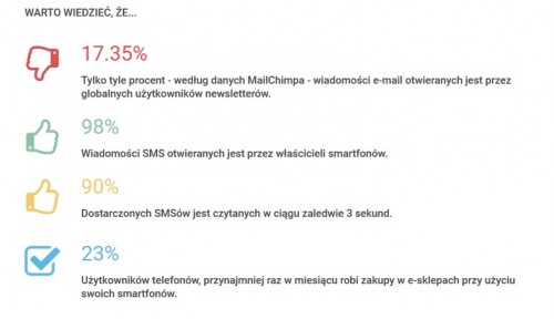 SMSy lepsze w kontakcie z Klientem niż mailing? Owszem – według MailChimp tylko 17,35% wiadomości odbieranych jest przez globalnych użytkowników newsletterów, a wiadomości SMS otwiera 98% właścicieli smartfonów – 90% z nich czytanych jest w ciągu zaledwie 3 sekund.