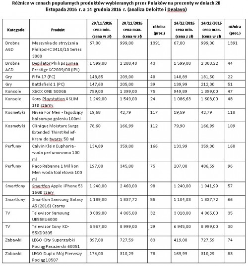 Różnice w cenach popularnych produktów wybieranych przez Polaków na prezenty w dniach 28 listopada 2016 r. a 14 grudnia 2016 r.