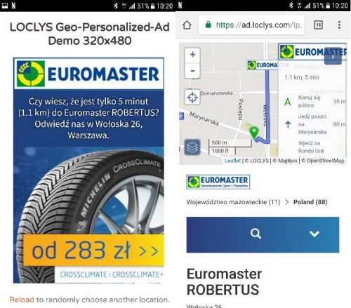 Branża reklamowa monitoruje trendy konsumenckie i stara się dopasowywać ofertę tak, aby spełniała oczekiwania marketerów. Nie pomija również opisywanego trendu tzw. „drive to store”, czyli wykorzystania mobile do kierowania konsumentów do punktu sprzedaży. Kreacja nawigująca ma przekaz zbliżony do znanego nam z billboardów na ulicach, informujących np. że do najbliższego Auchan jest tylko 7 min, dystans ok 1,5 km. Zaimplementowanie takiego rozwiązania w mobile daje fajny efekt, biorąc pod uwagę, że po kliknięciu dostajemy precyzyjne wskazówki dojazdu zobrazowane mapką oraz danymi kontaktowymi np. godziny otwarcia czy numer telefonu. Kreacja może być uzupełniona o licznik czasu pozostały do zamknięcia punktu, a emisja może być zsynchronizowana w taki sposób, aby wyłączać się w momencie, kiedy kierowanie konsumentów do punktu staje się bezsensowne. Korzyści dla konsumenta jest wiele, ale również marketer może czerpać dodatkowe insighty z tego formatu, np. skąd najczęściej przyjeżdżają do niego klienci? Jaki jest średni dystans dojazdu? W jakie dni najczęściej klikają poszukując serwisu wulkanizacyjnego etc.