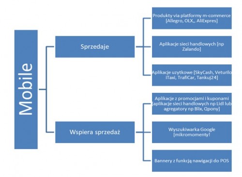 Na użytek niniejszego opracowania powstał poniższy wykres, który systematyzuje najpopularniejsze rozwiązania wykorzystujące mobile w sprzedaży: