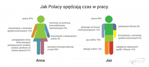 Polacy w godzinach pracy chętnie korzystają z prywatnych skrzynek pocztowych, portali społecznościowych, komunikatorów internetowych, przeglądają strony www oraz fora, robią zakupy online, grają w gry online, oglądają filmy video. To oczywiste, że każdemu potrzebna jest chwila wytchnienia, ważne jednak, by zachować w tym umiar – tłumaczy Beata Kwiatkowska, Dyrektor Zarządzająca w firmie Axence, oferującej oprogramowanie nVision do monitorowania aktywności użytkowników pracujących na komputerach.