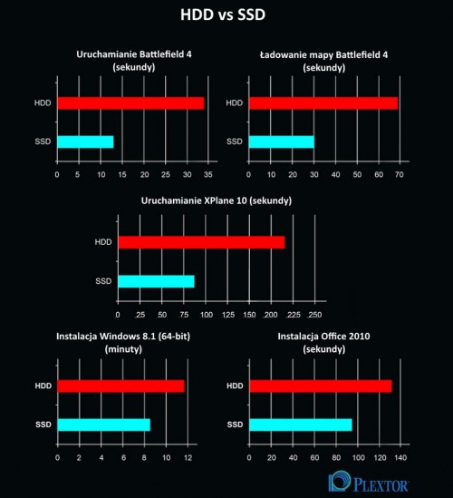 Warto posłużyć się tu wynikami z testów przeprowadzonych przez markę Plextor. Zainstalowanie gry Battlefield 4 na dysku SSD, skraca czas potrzebny do jej uruchomienia o blisko 2/3 (średnio z 35 sekund do 14 sekund). Wczytywanie map również jest szybsze. W grze wieloosobowej komputer wyposażony w dysk HDD potrzebuje na to średnio 70 sekund. Maszyna z dyskiem SSD już tylko ok. 30 sekund. W przypadku symulatora XPlane 10 różnice są jeszcze bardziej znaczące. Na komputerze z klasycznym dyskiem twardym, tytuł uruchamia się średnio 210 sekund. Zastąpienie napędu HDD przez SSD, bez wymiany innych podzespołów, skraca ten czas do ok. 90 sekund.