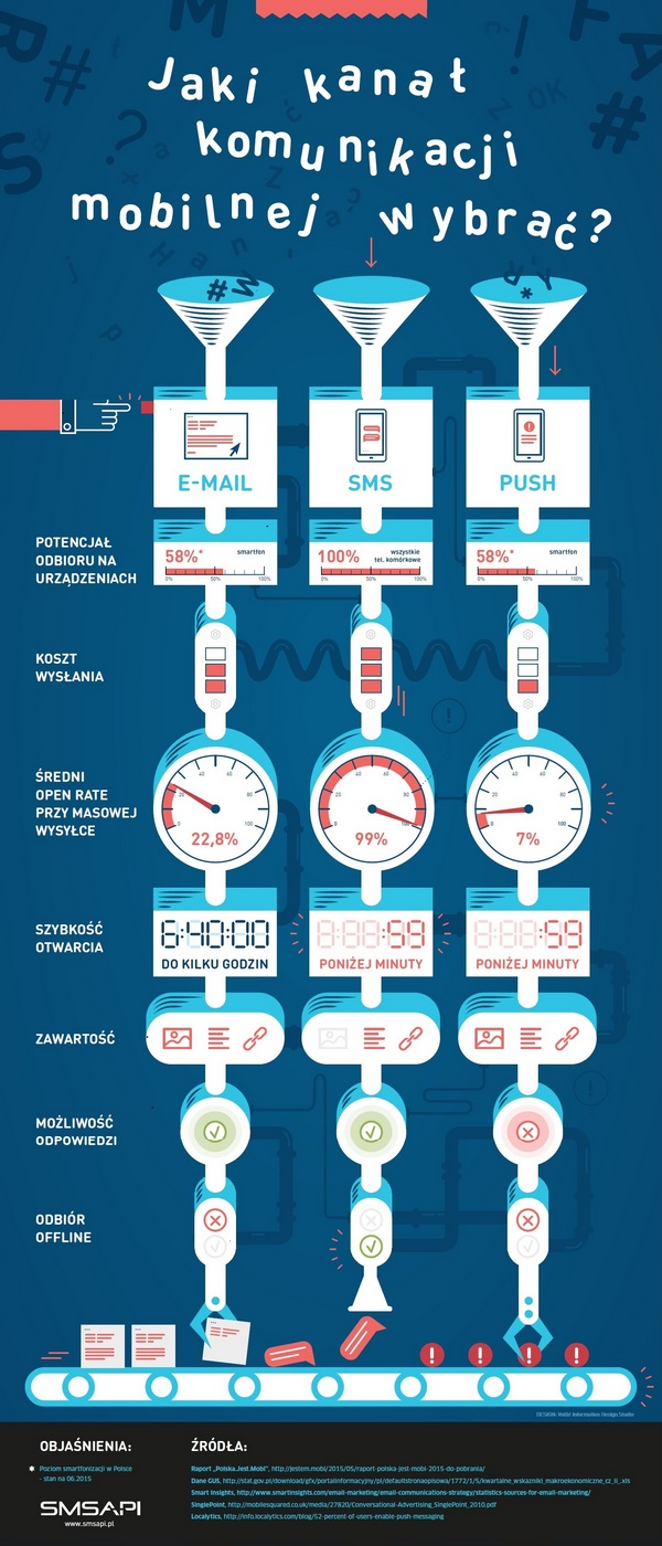SMSAPI – operator platformy ułatwiającej komunikację firm z klientami za pośrednictwem wiadomości SMS, MMS i VMS – przygotował infografikę, dzięki której w prosty sposób można porównać, czym różnią się trzy rodzaje komunikatów odbieranych przez użytkowników telefonów komórkowych i smartfonów. Aby w jak najdokładniejszy sposób pokazać jaka część Polaków może otrzymywać wiadomości e-mail i push, skorzystano z najbardziej aktualnych statystyk dotyczących smartfonizacji w Polsce. Dzięki temu możemy dokładniej określić grupę osób korzystających z urządzeń pozwalających odbierać powiadomienia push (za pomocą aplikacji) oraz korzystać z poczty elektronicznej.