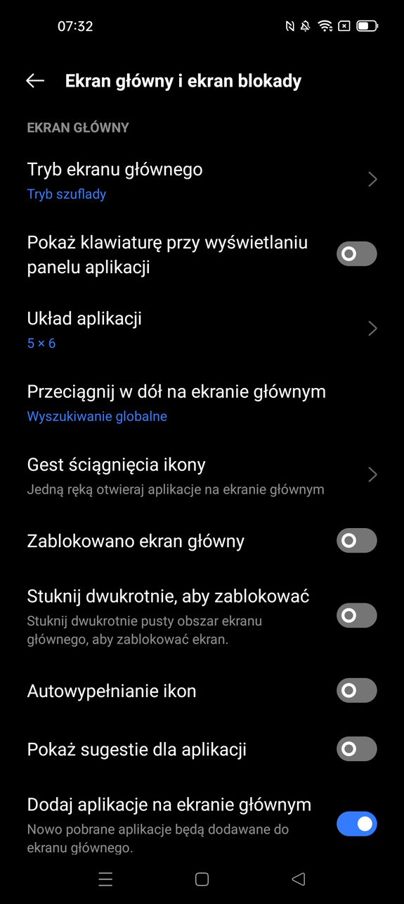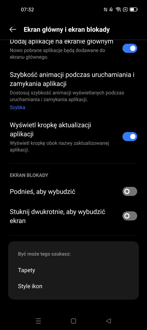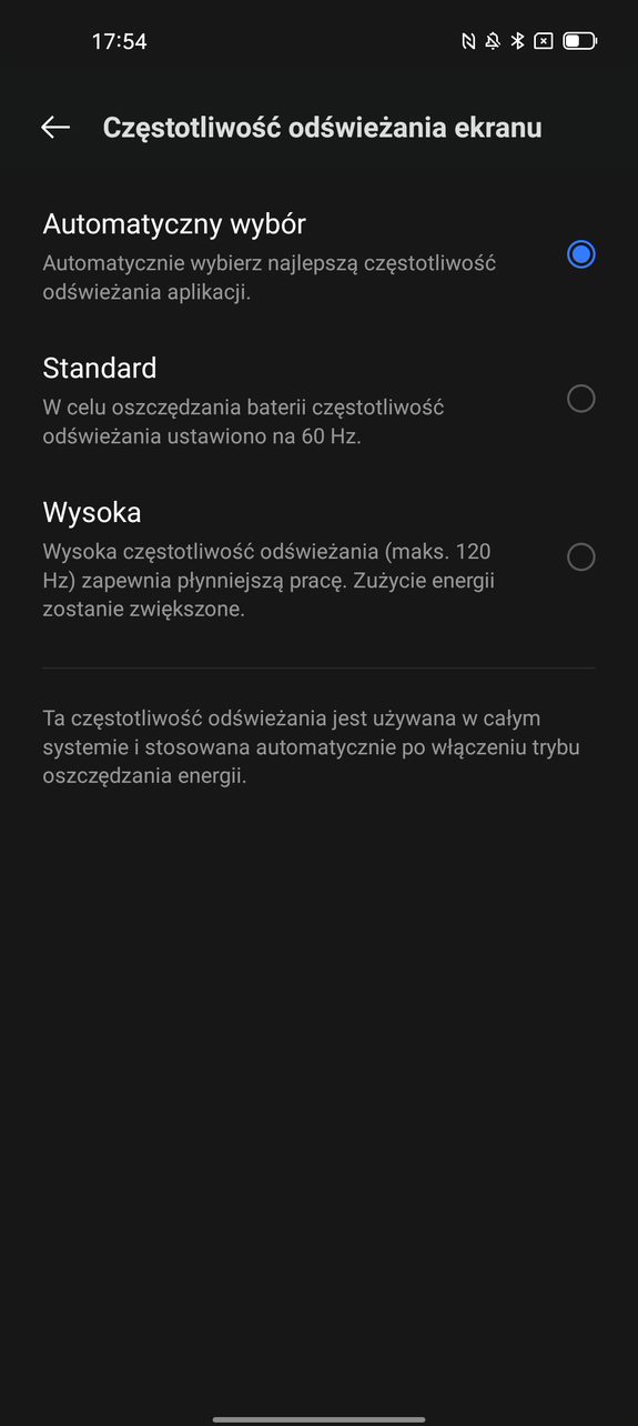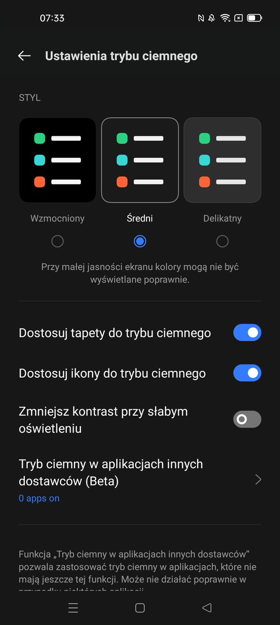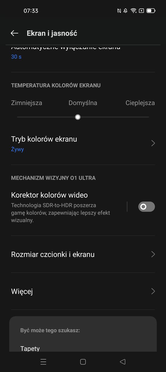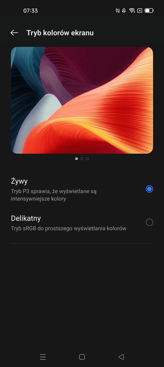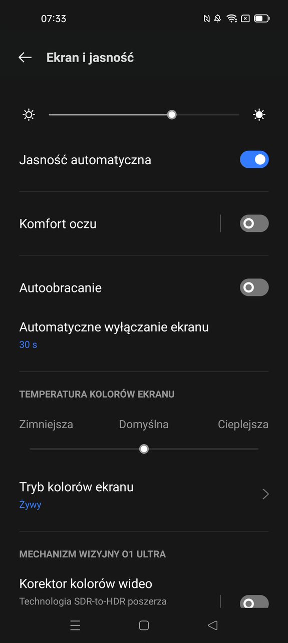 Smartfon oferuje oczywiście możliwość dopasowania parametrów ekranu takich jak: temperatura ekranu (zimna, domyślna, cieplejsza), tryb kolorów ekranu (żywy, delikatny) czy jasność, ale również posiada dodatkowy tryb ciemny oraz tryb ochrony oczu (Komfort oczu). Co więcej nie znajdziemy w nim diody powiadomień ani AOD.